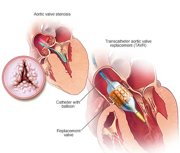 Transcatheter aortic valve replacement (TAVR) is a procedure to replace an aortic valve that is narrowed and doesn't open fully. The aortic valve is between the left lower heart chamber and the body's main artery. Narrowing of the aortic valve is called aortic valve stenosis. The valve problem blocks or slows blood flow from the heart to the body.