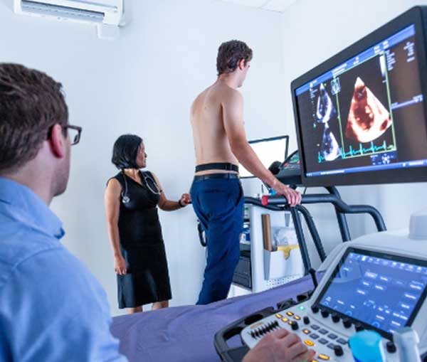 You will be given a loose-fitting gown to wear and asked to undress from the waist up. Electrodes will be placed onto your chest so that your ECG can be monitored throughout the test. A series of resting ultrasound images are taken. To do this, the sonographer will apply ultrasound gel to different areas of your chest and use an ultrasound probe to take pictures and recordings of the heart. You may be asked to hold your breath at times. Resting blood pressure, oxygen saturation and ECG recordings will be taken. The cardiologist will be continually monitoring these throughout the remainder of the test.